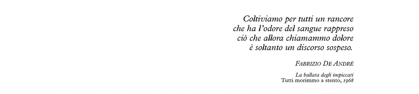 I piccoli hanno abbassato lo sguardo sui propri piatti vuoti e un io imbarazzante carico di rancore velenoso deve aver riempito l’intero invaso dell’animo della donna. Sappiate anche che l’uomo, a scoppio ritardato, ha battuto ripetute volte un pugno sul tavolo che di solito, per quei poveretti spaventati a morte, è l’anticamera di una violenza che alla fine del pasto, sarà cruenta.