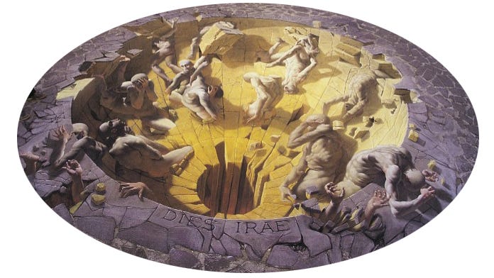 Voglio illustrarvi la scena tramite uno zoom-out come se steste vedendo un immenso diorama grazie a questa maestosa sequenza maestra. Immaginate un lento movimento di ripresa in plongée che mostra l’enorme disegno visto dall’alto dell’artista: un trompe-l’oeil di fattura superiore a quello del più apprezzato writer della street art o di un esperto madonnaro nostrano. L’immagine presenta una voragine con dentro poveri diavoli scalmanati e mostri raccapriccianti.
